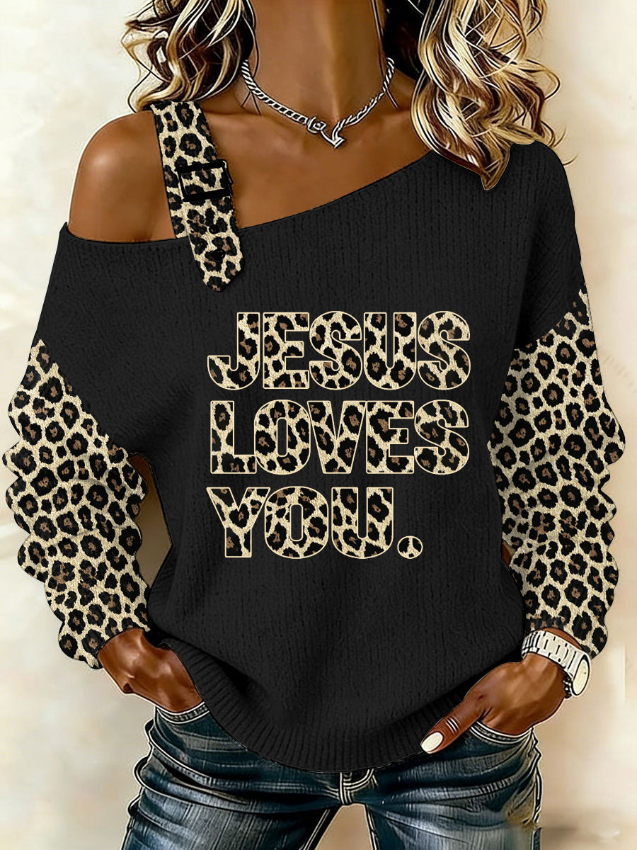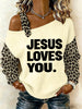 Women's Jesus Loves You Leopard Print Casual Off-Shoulder Top